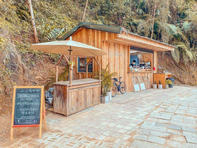 上山喝咖啡位於大山背逃學步道口,木造的咖啡屋加上兩層戶外的露天座位區可以將眼前美麗的山景盡收眼底。除了可以悠閒的喝咖啡放空之外,如果在吃飽喝足之後想要稍微活動一下身子,也可以到逃學步道走走逛逛,呼吸山上的新鮮空氣,欣賞沿途的風景。