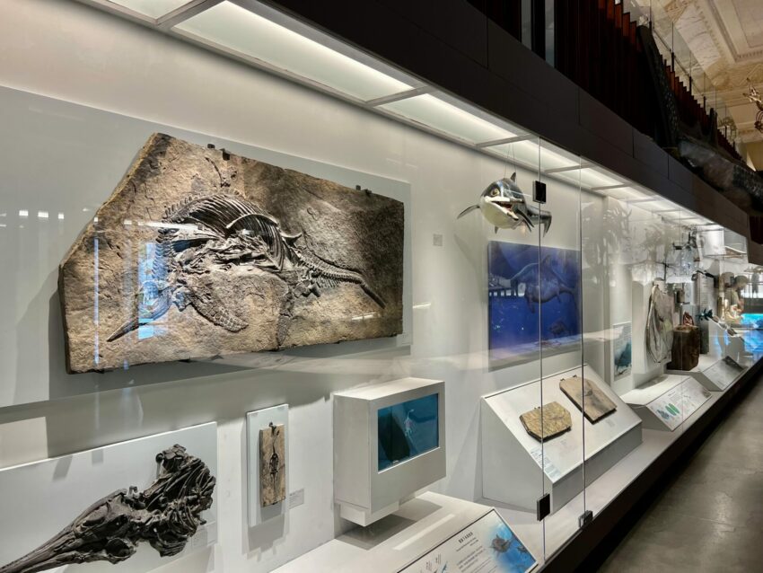 看似廣闊且不變的海洋,在海浪下的世界隨著時間的推移已經歷許多的變化。在第一批生物離開水面之前,海洋中的生物已經演化超過了30億年。其中,就包括了三葉蟲、菊石、鸚鵡螺、海百合及魚類,展覽中透過豐富的化石展件,呈現這片古海洋的繁盛樣貌