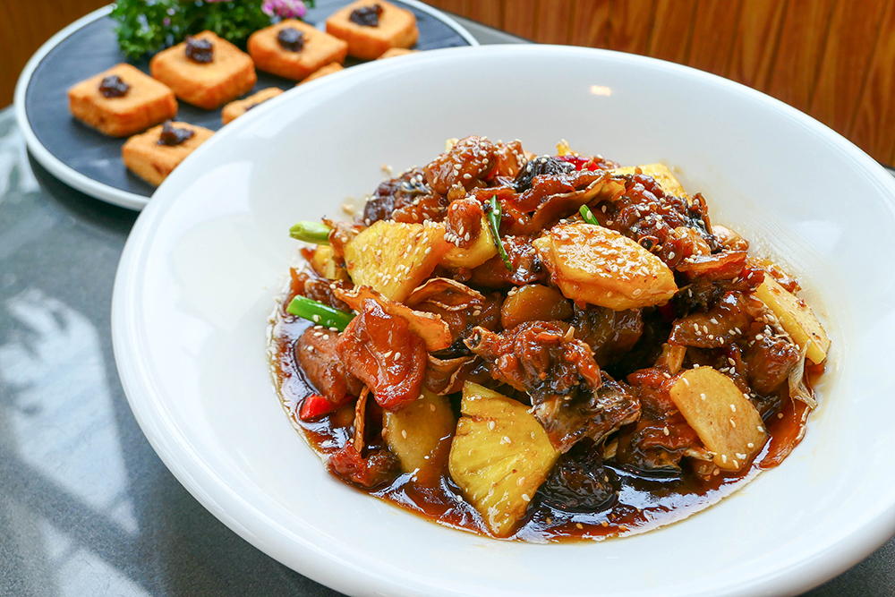 梅子雞使用的梅醬,是經過十幾年來不斷添加再熬煮而成的陳年老醬,味道醇厚回甘;看似簡單的筍子,加入自家薑黃和魚腥草提味後,散發有個性的淡雅辛香氣。菜園裡俗稱「醜豆」的粉豆結成一串串,摘下來和甜菠菜清炒,天然清甜讓人越吃越順口。彈牙山豬肉或猴頭菇搭配田園野菜拌炒,不論是菠菜、萵苣或白鳳菜,都呈現了味覺的多重宇宙。