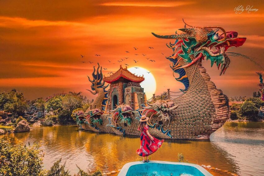 早期鎮安宮前方天然沙坵及池塘,非常雜亂,經過美化及改建,現在更成為全台最大、最有特色的寺廟主題公園,公園內的路線彷彿像是一座大迷宮,沿途會行經奇山怪石造景、高聳天空的彩虹橋,還有侏儸紀世界的暴龍,多達70多種特殊打卡景點,邊走邊拍也要兩個小時才有辦法走完全程喔!