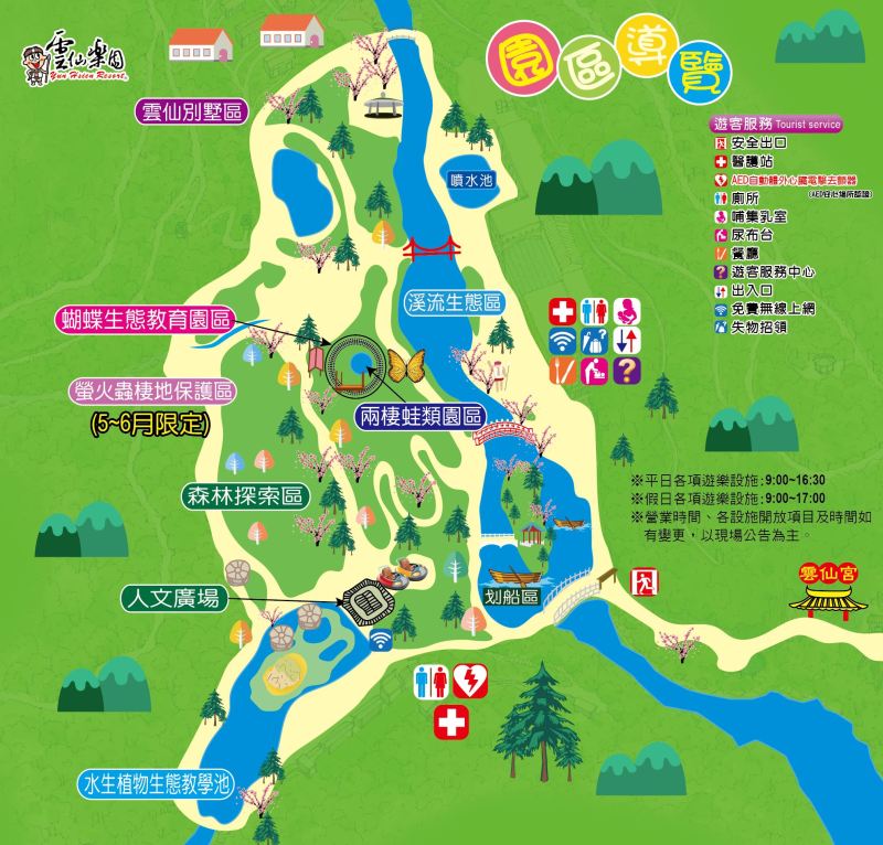 烏來雲仙樂園佔地廣闊,有多處的生態區能探索,如:溪流生態區、蝴蝶生態教育區、兩棲蛙類園區、森林探索區、水生植物生態教學池等。另外也有人文廣場、噴水池與划船區適合與親朋好友或伴侶邊走邊玩。