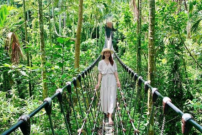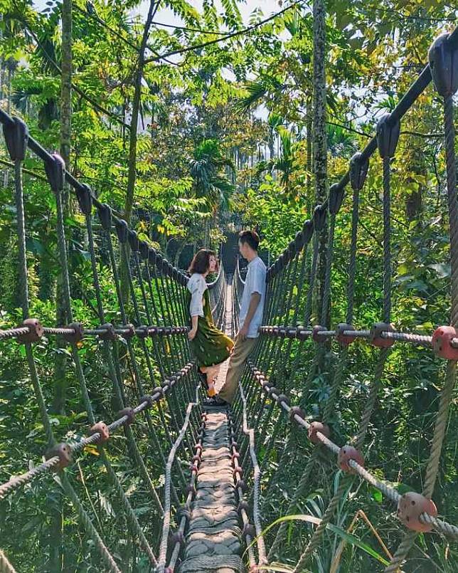 隱身在雲林山中,使用繩索編織製成的這座吊橋,因為限載兩人又被大家稱為《情人橋》,情侶兩人一起走在搖晃狹窄的橋上,有如森林裡冒險般的刺激感,走在橋上可以遠眺雄偉的大小尖山景,走到最高點,回頭眺望吊橋全景時,寬闊的視野帶給人放鬆的心情,在吊橋前端拍照彷彿像置身峇里島雨林之中。