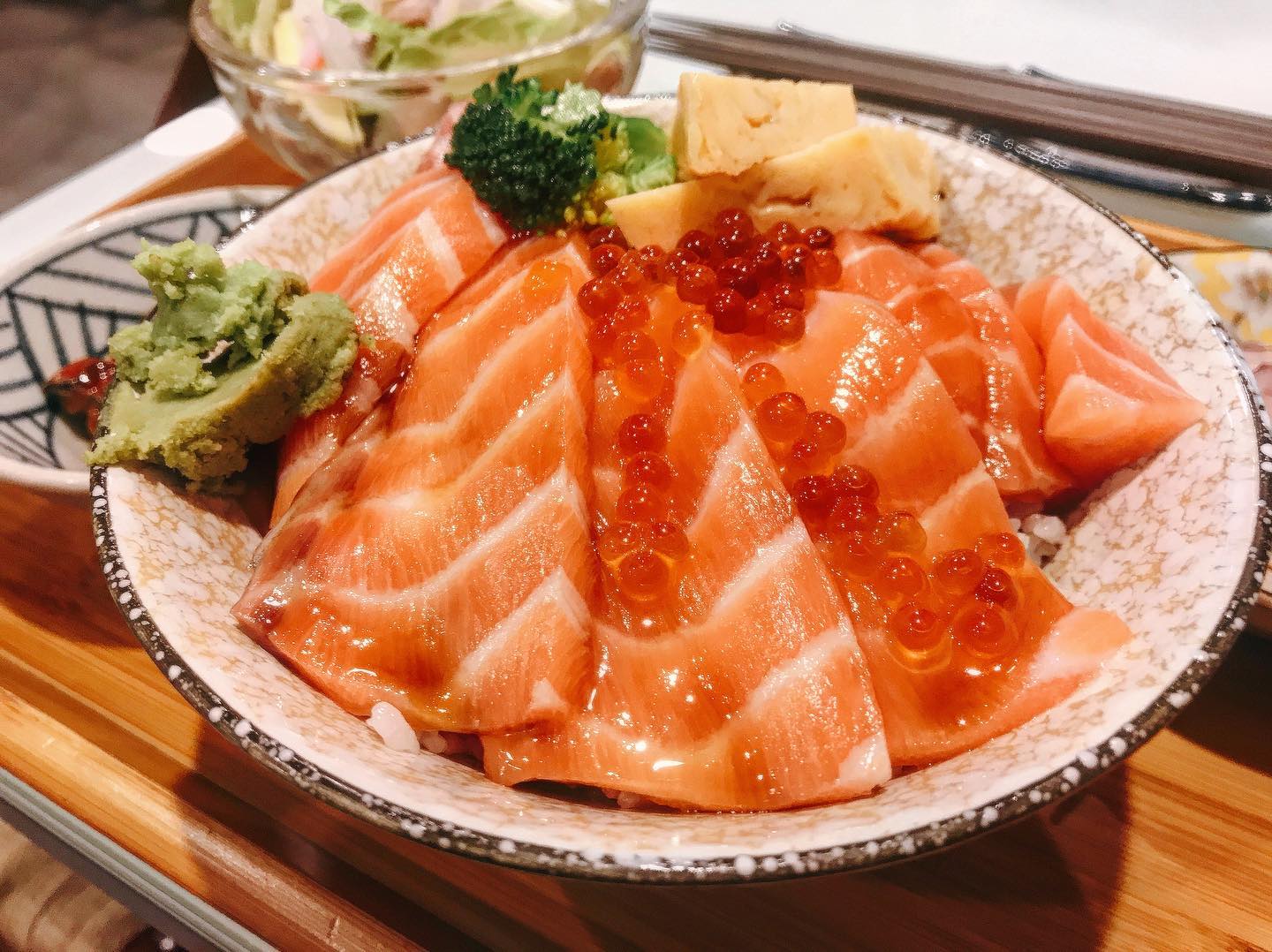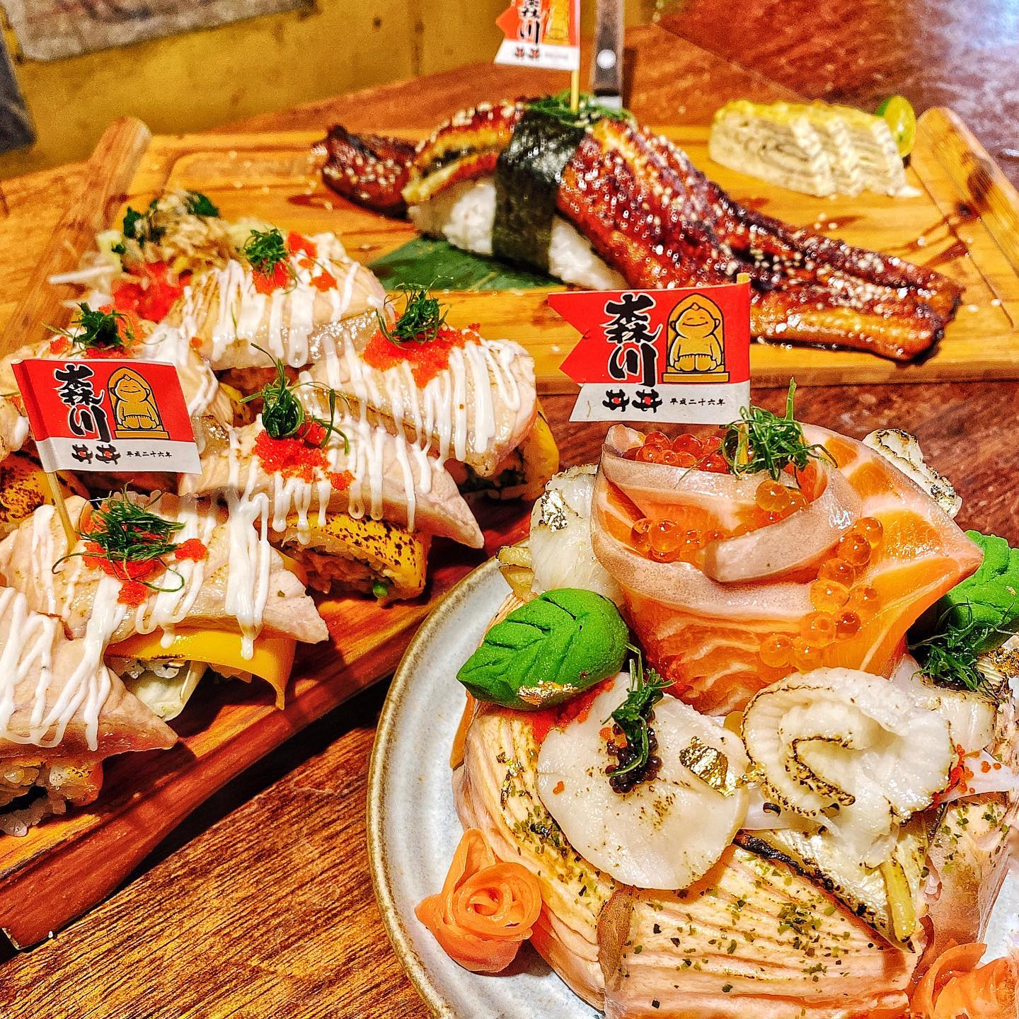 「森川丼丼」是一間充滿居酒屋風格的日料專賣店,這裡除了有平價實在的丼飯、壽司、生魚片等豐富料理,價格稍高的隱藏版菜單也令人驚艷。其中無論是全台首創、限量供應的「巨大野鰻握壽司」,還是附上整杯鮭魚卵、鋪上滿滿1855牛小排的「排山倒海丼」都是必點品項;此外若想來場歡樂生日party,也可以提前一天預訂華麗精緻的限量「四吋海景盛和蛋糕」,同時滿足平價和高級兩種需求。
