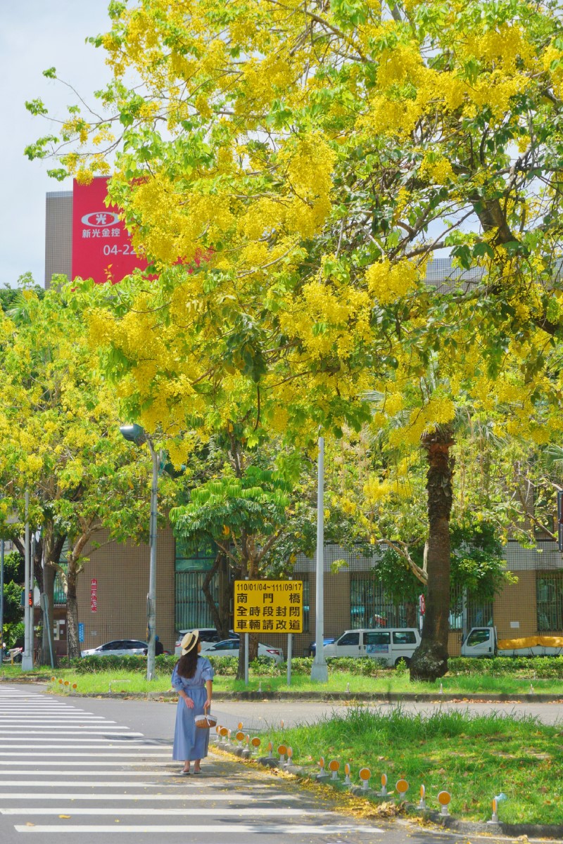 自行車道位於228紀念碑和中興大學附近、台中路和興大路的交叉口,此處非交通要道所以無論是視覺、聽覺、嗅覺都來的舒適許多,有如城市中的一處秘密花園,前陣子的落雨讓花瓣掉落後,綿延數尺的黃金地毯甚是美麗,若想在此留下紀念身影,無論是抬頭望向天空中的枝節或是坐在花毯上的意境照都非常動人,也提醒民眾在賞花拍照的同時注意自身安全,留意來往車輛,並與旁人保持安全社交距離喔。
