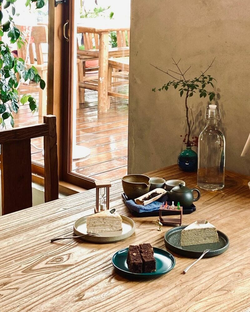 在中興新村逛完一圈,如果想要找個地方好好坐下來,不妨到隱身於中興新村老宅內的丘山茶坐下來喝杯茶、吃個甜。丘山茶內的飲品有茶類、咖啡、果汁等;其中,茶類的部分是以人數和茶葉的種類來區分價錢,可以使用店內提供的泡茶工具來品茗,享受泡茶的樂趣。另外,店內也有提供甜點,其中最有名的就是千層蛋糕,非常適合和朋友一起泡茶聊天。