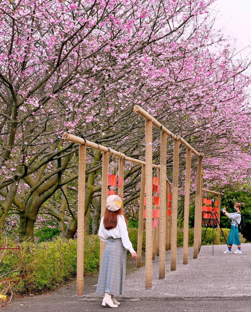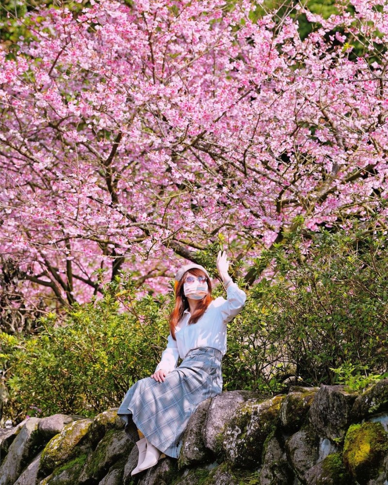 而在天壇旁種植了「吉野櫻」,相較於三色櫻晚一個月開花,大約為每年三月中下旬至四月,這兩種櫻花花期接力綻放,紅色與粉色交錯,賞櫻再加上能眺望遠方的風景相當浪漫,美景讓賞花遊客們絡繹不絕,是在IG上的打卡熱點之一。