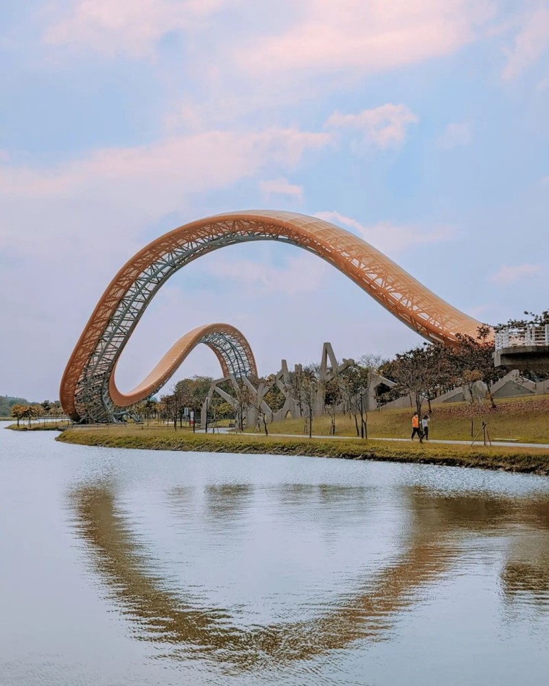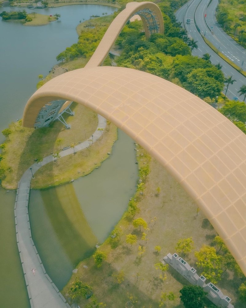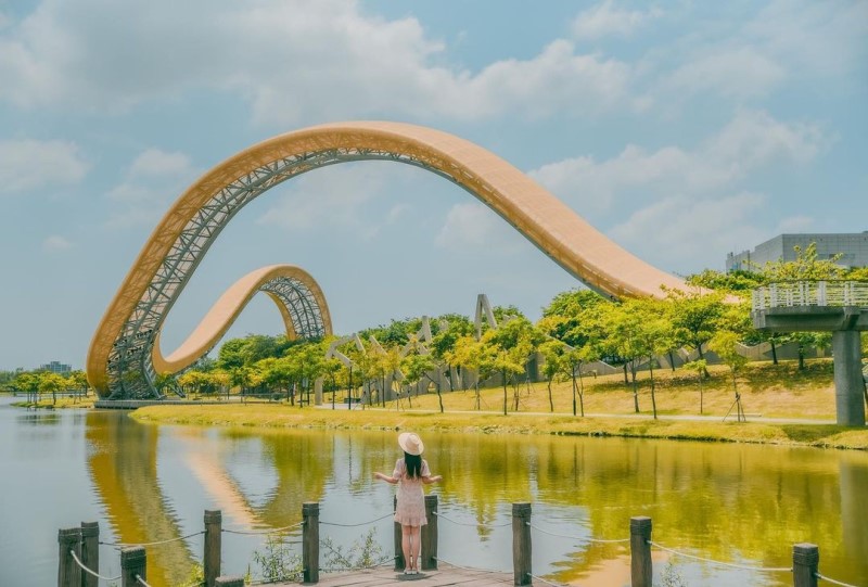 這座巨型黃金絲帶位在園區內旁,湖面向東方,每天早晨都能迎接美麗的曙光。白天湛藍的天空、翠綠的草地與金黃的絲帶,形成療癒感十足的和諧色調;入夜後,環繞在迎曦湖畔旁的燈光倒映在湖面上,為整體氛圍增添一層浪漫氣息。偌大的湖畔設有許多觀景平台,到此朝聖的朋友可以從多種角度欣賞這獨特的美景,拍出獨一無二的美照。