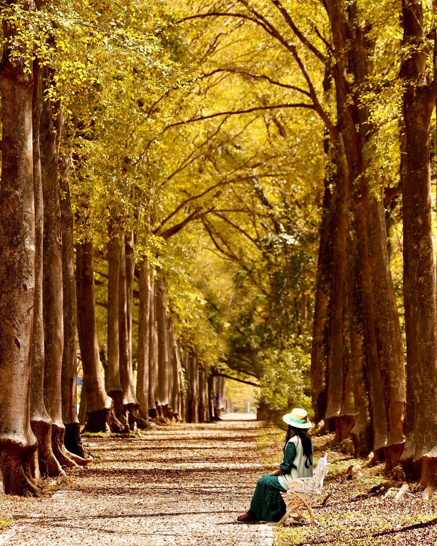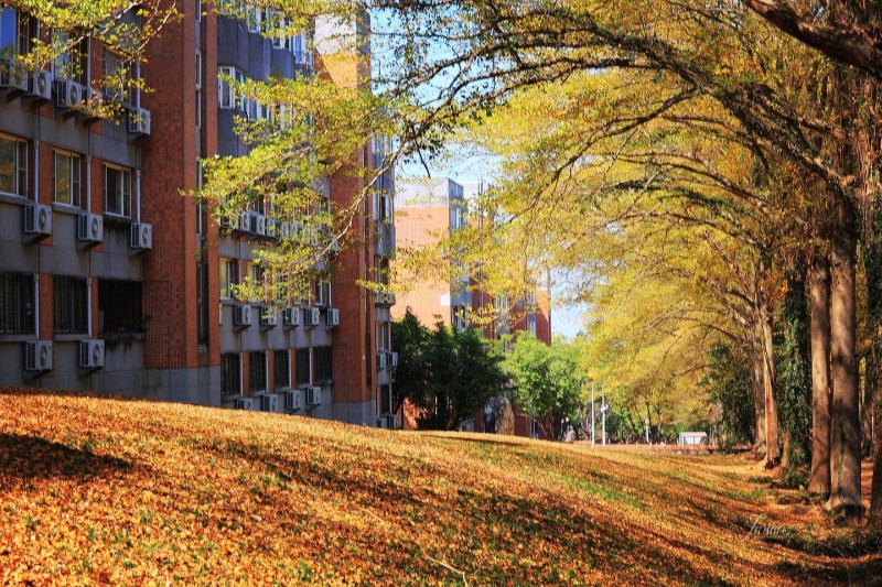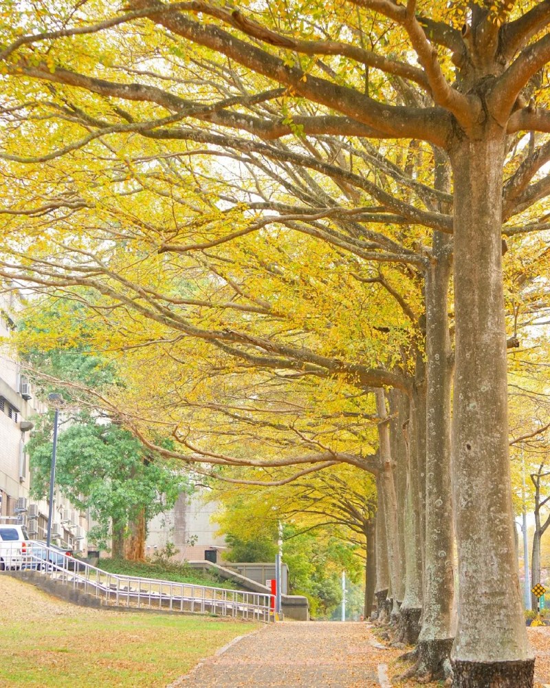 在嘉義中正大學校園內有一段長達四公里的小葉欖仁大道,道路兩側種植了超過千顆的小葉欖仁樹,每到這個時節整條人行道便會開始換上新衣裝。樹葉被微風吹落鋪滿了道路,成了天然的黃色地毯,與從枝椏間灑落的陽光交織成絕美的「黃金雨」,唯美的景象讓人彷彿置身國外,讓人久久不肯離去。