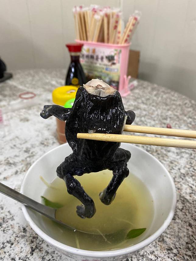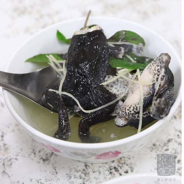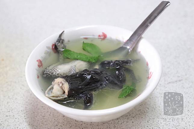 圓環紅燒青蛙湯僅白天營業,太陽下山後,想吃青蛙湯就得到傍晚才營業的一郎土魠魚羹,但僅清燉口味。一郎的清燉青蛙湯同樣一碗兩隻,皮Q肉滑,味道甘鮮。