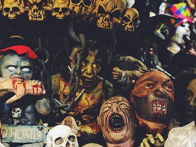 店上左右皆是嚇人面具與蜘蛛絲的樓梯,一進店門映入眼簾的就是面目猙獰的骷髏、流淌鮮血的惡靈與妖怪;眼角一轉,小編即看見一面陳列著惡煞、怪獸與神魔面具的牆(嚇歪),而另一端則是密密麻麻的魔術道具如心靈透視骰子、會斷的湯匙,整人玩具臭臭菸、癢癢粉、假鳥屎等趣味小物。(暈)