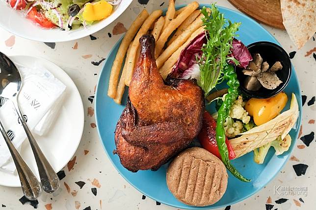 芥辣半雞屬主廚排餐系列,因此整份餐點相對豐富,除了主食,並附有煎烤蔬菜 、每日變換的特色小菜、薯條和雜糧麵包,另外還可點選 $120的飲品。如此有肉、有菜、有澱粉,攝食元素很是齊全。