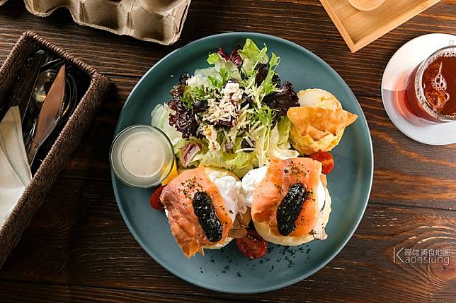 歐式手作小圓麵包、醋炒蕈菇、水波蛋、嚴選挪威煙燻鮭魚,最後點上特製松露醬,層層疊疊一山丘。