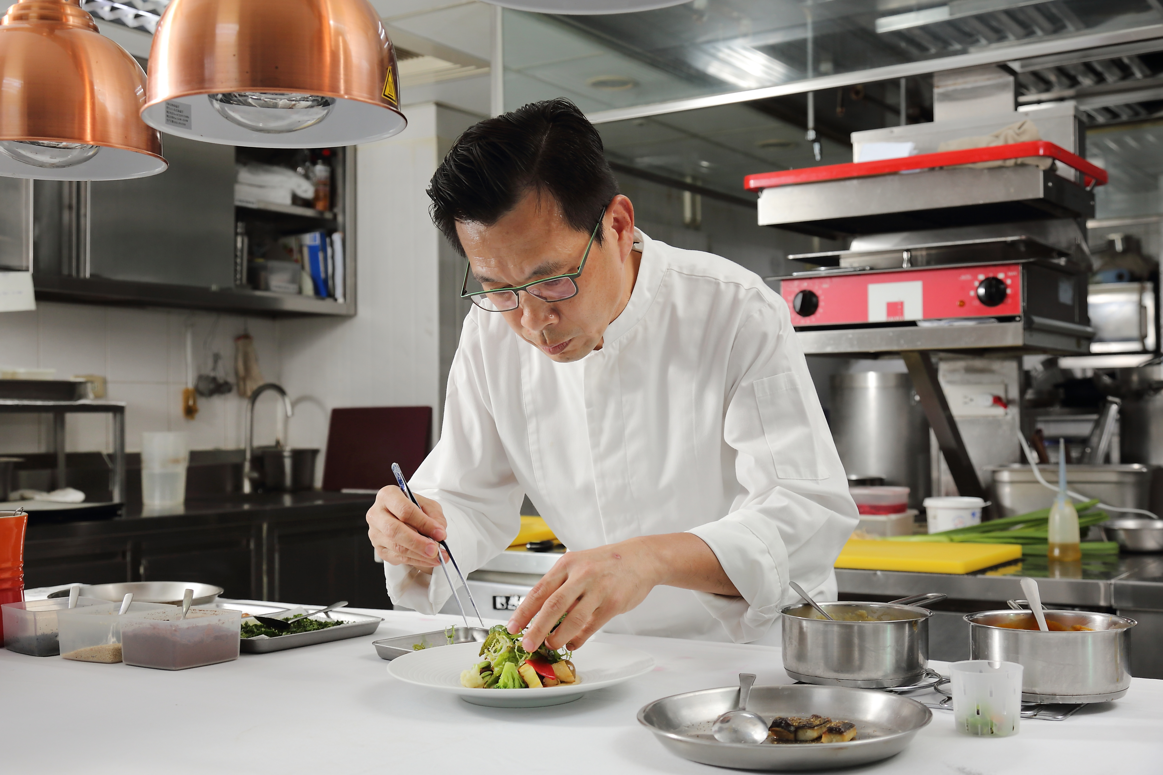 除了食材選擇,簡天才對環境永續的關注也表現在其他方面,例如,將每日未售出的麵包送至食物銀行,收集燉雞湯的浮油爆香油蔥酥,蒜苗尾段、胡蘿蔔和蔬菜切剩的邊料則用來熬湯,從每個小細節實踐食物不浪費的原則。此外,為了減少碳排放、避免糧食短缺,無肉飲食逐漸成為趨勢,餐廳菜單中也逐步調整肉類、海鮮和蔬菜的佔比,慢慢提高蔬食選擇。