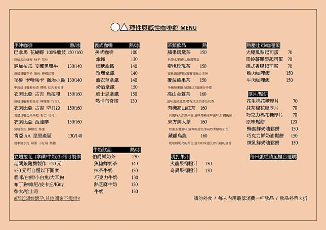 ▲理性&感性CAFE’菜單,低消一杯飲品/人