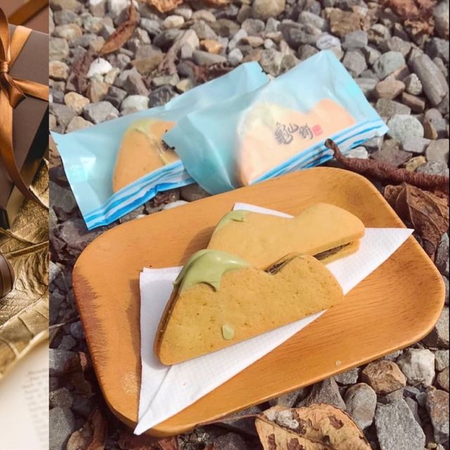 到宜蘭一定會看到龜山島,而龜山餅很有趣就是龜山島造型的所製而成,象徵了宜蘭的特色!餅乾上山峰是日本小山園抹茶,內餡是宜蘭冬山茶葉還添加了杏仁角,吃起來口感更豐富。這是一個很推的伴手禮~推薦必買!!