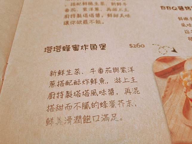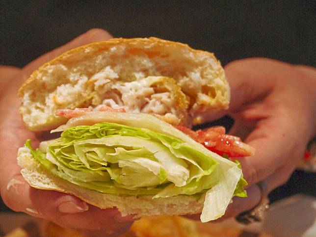 清爽的口感的塔塔蜂蜜炸魚堡,炸魚的酥脆外皮跟鮮嫩魚肉,淋上店家自製的塔塔醬,夾著大量的清爽生菜、牛番茄切片、紫洋蔥絲,這層層疊加的口感和塔塔醬鮮美醬汁,大口咬下,雖然是炸物,但一點也不會讓你覺得膩口。