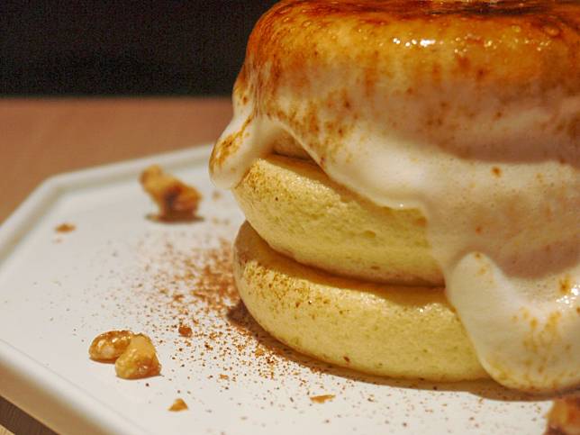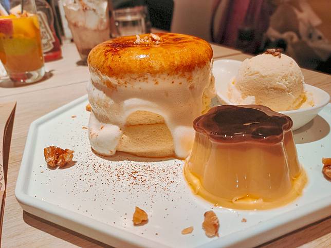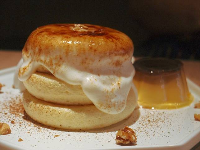 下午茶時段限定的焦糖烤布蕾舒芙蕾鬆餅,雖然製做的時間要20分鐘以上,但這道是絕對值得等待的美食。