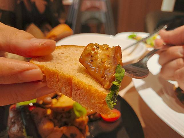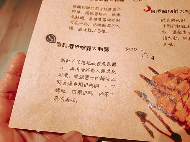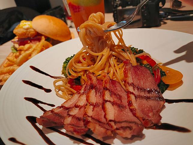 這一道青蒜櫻桃鴨義大利麵,用蒜苗搭配魚露、酒醋做為調料,讓義大利麵吸附滿滿的鹹香醬汁,上層舖著的櫻桃鴨胸帶有煙燻香氣,越嚼越有滋味,麵裡搭配的蔬菜也是十分的鮮爽多汁。