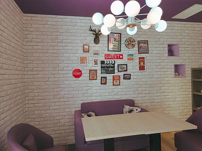 店內紫色與白色調風格讓人視覺放鬆,店裡座位從單人、兩人、到八人和沙發區都有,也有wifi和插座,空間清爽舒適。