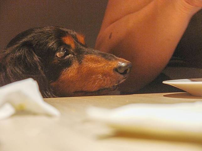 一桌的美味,讓狗狗也露出渴望的小眼神。