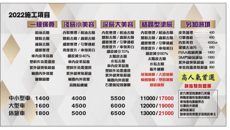 一般洗車、汽車美容、車體鍍膜、玻璃鍍膜、刮痕去除、門碗犀牛皮、PIAA雨刷