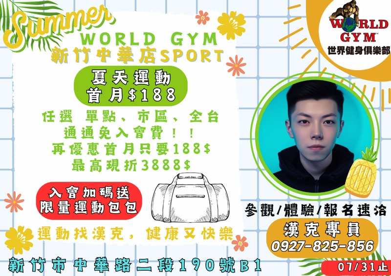 World Gym健身俱樂部為全台最多首創與獨家的健身房,首創心肺器材視覺虛擬實境系統,獨家代理Booty Coaster翹臀神機、RealRyder搖擺飛輪腳踏車、Stages Flight 互動式飛輪訓練系統、視覺虛擬飛輪教室、MYZONE心率帶系統...等,非常豐富的健身房。 World Gym健身房擁有最專業的教練群及健身諮詢顧問、最先進專業的運動器材、最多的運動及舞蹈課程。 【分店位置】 World Gym新竹巨城店Sport位於BigCity黃金商圈地段。 【周圍環境】 鄰近巨城商圈、新竹火車站商圈。 【特色介紹】 World Gym巨城店擁有每週豐富多元的團體有氧課程、高科技心肺器材及專業重訓器材,搭配五水道溫水室內游泳池、冷熱SPA水療池、烤箱、蒸氣室等設備。 【特殊設施】 拳擊場、TRX、多功能草皮訓練區、蒸氣室、烤箱、SPA池 室內溫水游泳池:長25公尺、寬3.75公尺、深1.2公尺、5個水道 (06:00-23:00開放) 汽車:免費停車3小時 機車:無
