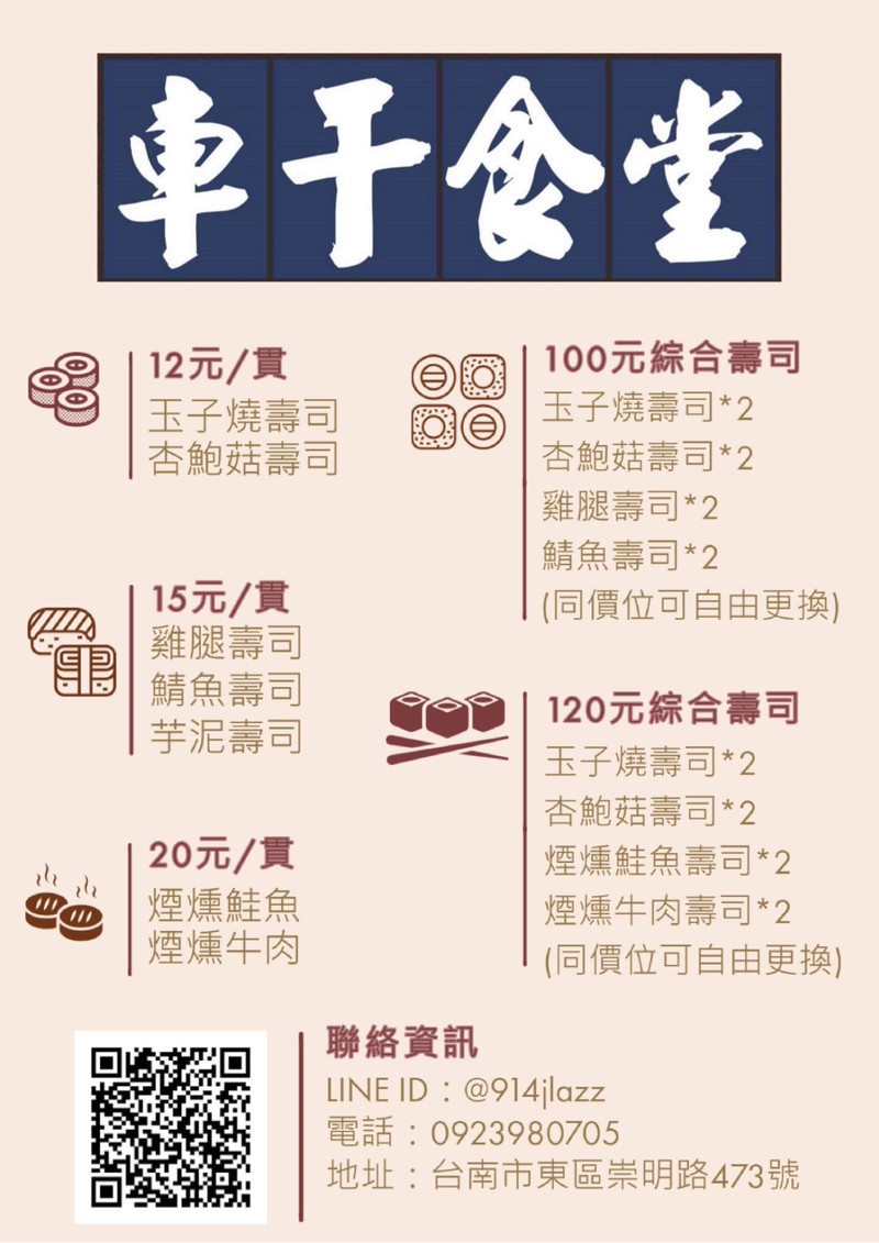 隱身於公寓大樓的美食‼️ 🥢玉子燒壽司12元/貫 🥢鯖魚壽司15元/貫 🥢雞腿壽司15元/貫 🥢杏鮑菇壽司(全素)12元/貫 🥢綜合壽司(以上4種口味各2顆)特價100元 🌱季節限定|芋泥壽司15元/貫 ⭐️煙燻鮭魚壽司|20元/貫 ⭐️煙燻牛肉壽司|20元/貫 ✅工作室僅提供外帶/外送 ✅最晚提前一餐訂餐!(可提前幾天訂餐) ✅營業時間|10:30-13:30/16:00-19:00 ✅工作室地點|台南市東區崇明路473號(公寓大樓1樓取餐) 🔥最新資訊請至臉書粉絲團|車干食堂FB:https://reurl.cc/l0aE1l ✏️訂單範例| 1.100元綜合壽司1份 2.玉子燒*3顆雞腿*2顆 3.玉子燒*2顆鯖魚*3顆杏鮑菇*2顆 12/15 林小姐12:00取餐