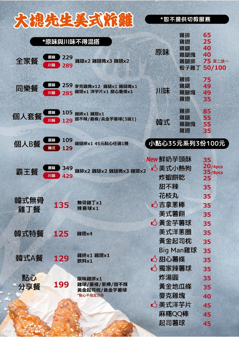 紐澳良系列:雞排/雞腿/雞腿塊/雞翅 獨家川味配方醃漬:川味雞排/雞腿/雞腿塊/雞翅 大塊韓式醬韓式系列:雞排/雞腿/雞腿塊/雞翅 各式顛覆傳統的小點心