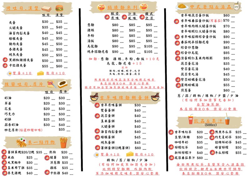 叢早到晚 專賣(晚餐&宵夜) 營業時間- PM17:00-AM02:00 鍋燒麵/炒飯/炒麵/古早味蛋餅/餛飩麵/吐司/漢堡/厚片/炸物/小吃/飲品/果汁 位於三多捷運站及圖書總館.捷運走路3分鐘 固定公休日-每個月隔週休日 其它公休_粉絲團&IG都會公佈 因人手有限.外送可來電詢問🤗