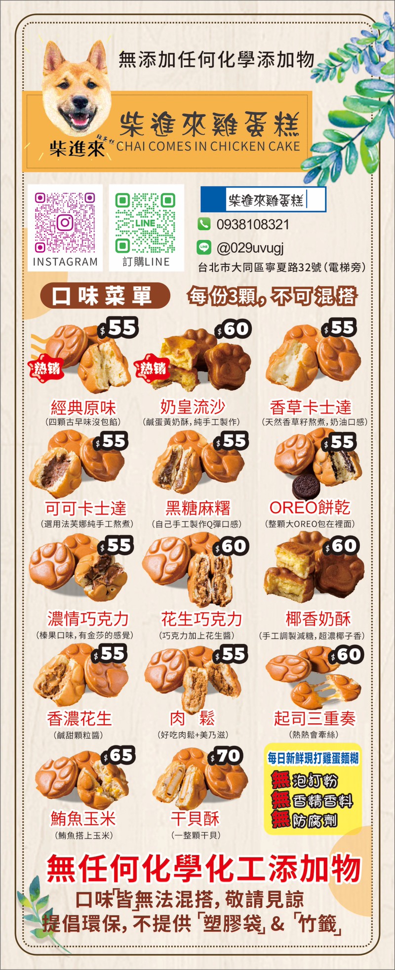 👇🏻柴進來的雞蛋糕👇🏻 🚫無添加任何化學添加物 🚫無添加泡打粉、乳化劑、膨脹劑、防腐劑、合成奶油 🚫無添加香精、香料、色素 🚫不使用漂白麵粉 🚫不使用市售配方粉、雞蛋粉 🚫不使用隔夜麵糊⠀⠀⠀⠀⠀⠀⠀⠀⠀⠀⠀⠀ 💯使用食用級鐵氟龍鍍膜⠀⠀ 💯每天新鮮現打雞蛋麵糊 🆕口味菜單: 🚫每份4顆,不可混搭 甜🔸原味(無包餡,外酥脆內紮實)$50 甜🔸香草卡士達(天然香草籽熬煮,奶油口感)$60 甜🔸可可卡士達(香濃可可純手工熬煮)$60 甜🔸黑糖麻糬(自己手工製作Q嫩口感)$60 甜🔸OREO香草餅乾(整顆OREO包在裡面) $60 甜🔸榛果巧克力 (榛果口味,有金莎口感) $65 甜🔸椰香奶酥(滿滿椰子香,像椰子麵包)$70 鹹甜🔹香濃花生(鹹甜顆粒醬)$60 鹹甜🔹花生巧克力(新貴派口感)$70 鹹🔹肉鬆(肉鬆+美乃滋)$60 鹹🔹起司三重奏(熱熱會牽絲)$70 鹹🔹鮪魚玉米(鮪魚嫁玉米)$75 鹹🔹干貝酥(4顆)$80 招牌🔺奶皇流沙(鹹蛋黃奶酥)$70 ⚠️口味「皆」無法混搭,請見諒 ⚠️提倡環保,不提供「塑膠袋」&「竹籤」
