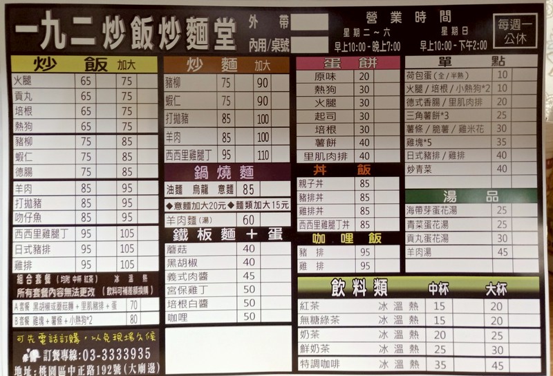 炒飯,炒麵,鐵板麵,飲料,湯品,丼飯,鍋燒麵,蛋餅
