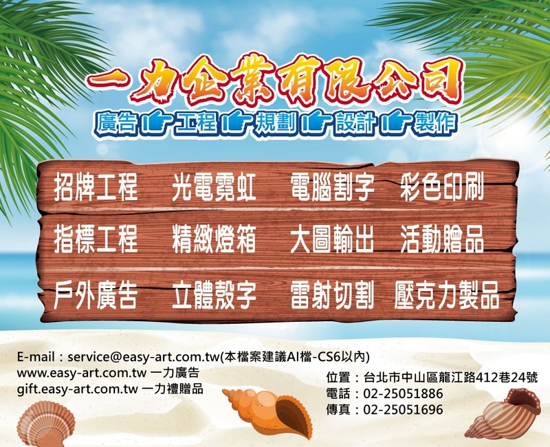 《服務項目》 店面招牌、指標門牌、戶外廣告、光電霓虹、精緻燈箱、壓克力製品、電腦割字、雷射切割、 立體殼字、大圖輸出、彩色印刷、活動贈品、設計、規劃、製作