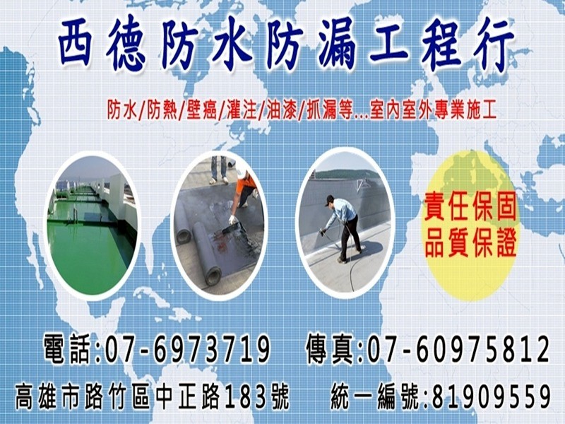 專業防水防漏工程~ 『室內外專業施工、價格公道、品質保證、真誠服務』 專業施工,品質保證,貼心的售後服務!修繕居家環境的專家,擁有快三十年的豐富經驗【西德防水防漏工程行】給您最信賴的安心保證!用心的團隊,最認真的態度,做好每一處細節,解決生活住宅各種惱人問題,客製化服務規模滿足各種預算的朋友! ❏屋頂平台、露台防水防熱工程 ❏外壁防水防熱 ❏磁磚外壁透明防水 ❏地下室抓漏工程(含廁浴室) ❏地下水池防水工程 ❏高壓灌注防漏工程 ❏室內壁癌劑特殊處理(含油漆) ❏房屋內建整修土水工程 ❏油漆工程 ❏居家室內外房屋修繕 服務涵蓋範圍:高雄各區域、外縣市區域 專業防水防漏工程~ 『室內外專業施工、價格公道、品質保證、真誠服務』 服務專線: 07-697-3719 0932-846627 蘇先生 0988-654553 蘇先生 傳真:07-607-5812 只要有任何漏水疑問,歡迎撥打電話,免費現場評估