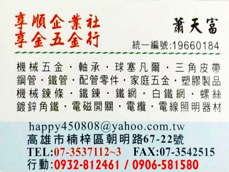 享金五金行.享順企業社 | 各式五金.機械五金專賣店 享金五金行(統編:19660184),本公司創立於1985年,位在高雄市楠梓區,專售各式五金/機械五金 營業項目: 電動.氣動工具修理 / 機械五金 / 軸承 / 球塞凡爾 / 三角皮帶 / 鋼管 / 鐵管 / 配管零件 / 家庭五金 / 塑膠製品 / 機械鍊條 / 鐵鍊 / 鐵網 / 白鐵網 / 螺絲 / 鍍鋅角鐵 / 電磁開關 / 電纜 / 電線 / 照明器材 / 電動工具 / 氣動工具 / 手工具 / 水電材料 / WD40多功能除銹潤滑劑 / 免螺絲置物架 地址:高雄市楠梓區朝明路67-22號 電話:07-3537112 / 07-3537113 傳真:07-3542515 行動:0932-812461 / 0906-581580 ( 蕭老闆 ) 行動:0937-013397 ( 蕭先生 ) 行動:0900-752080 ( 蕭小姐 )