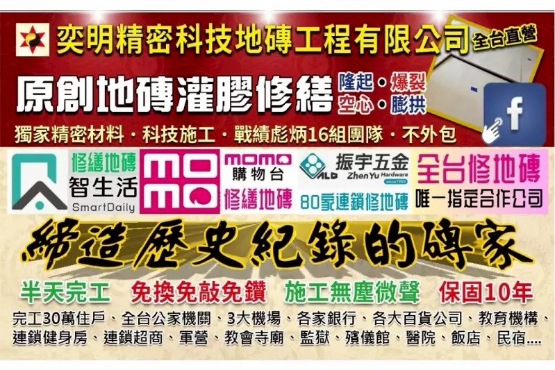 專業地磚修繕、地磚爆裂修繕、地磚隆起修繕、地板修繕、磁磚修繕~免破壞磁磚、無灰塵、微聲音、半天完工、保固十年~如果不幸發生空心、隆起、凸出以前傳統一般是以工人先敲掉地磁磚及水泥再重鋪設,(花費貴、麻煩、灰塵、搬家具、吵雜、髒亂、天數時間長)現在不用有上述的問題,如蒙不吝,請來電洽詢【奕明工程】師傅會視各個情況不同運用數種科學膠料,來幫您解決頭痛的各種地磚,地板、磁(瓷)磚,隆起、凸起、空心 膨龜、膨拱、爆裂…等問題。傳統泥作一般都是要全部敲除,歡迎讓本公司來幫您處理服務。創新如下:★《免敲》免打、免破壞磁磚、免打洞鑽孔★《整片灌注》非只做磁磚邊緣黏住,而是灌進磁磚底下溢滿黏硬住★《工時短》比傳統水泥工法快數多倍★《硬度強》黏度比水泥黏數多多倍★《無塵施工》環境無塵乾淨,免清潔。★《更安靜》施工聲音小又少★《保 固》做別人沒能做的十年保固如有疑問歡迎來電詢問!(快速價廉、地磚、地板、瓷磚、磁磚隆起、修補、整修、凸起、膨貢、空心、處理、修復、修繕、專業維修)● 三重總公司● 台北分公司● 台中分公司LINE ID搜尋:@k0955205219 手機專線:0955-205-219傳真專線:02-2287-6065LINE連結:https://line.me/ti/p/%40gkl7396a地址:台中市北屯區東山路一段207巷38弄37號營業時間:週一至週日08:00-21:00官網:https://www.0955205219.com/臉書:https://www.facebook.com/o0955205219YouTube影片介紹:【台灣藏寶圖】地磚隆起空心修繕-奕明工程-腳踏實地的安心 磁磚守護修繕專家https://www.youtube.com/watch?v=hJ_Z25aIqxo店家日報:https://buzzdaily.tw/store/yeh20151130009關鍵字查詢新北地磚修繕、新北地磚爆裂修繕、新北地磚修補、新北地磚隆起修繕、新北地板修繕、新北地板隆起修繕、新北磁磚修繕、新北磁磚爆裂修繕、台北地磚修繕、台北地板修繕、桃園地磚修繕、桃園地板修繕、