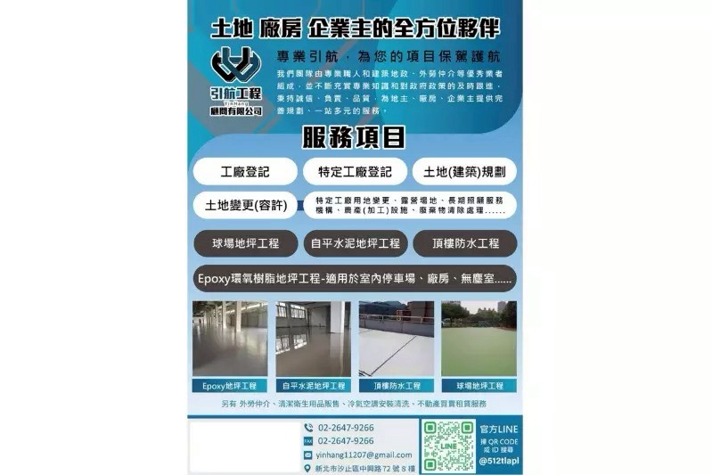 引航工程顧問有限公司是由專業職人和建築地政等優秀業者組成,團隊成員在各領域都有豐富的經驗。我們不斷充實專業知識,並及時跟進政府政策,確保能提供最先進的服務。我們秉持誠信、負責、品質的核心價值,致力於為地主、廠房和企業主提供完善規劃和一站多元的服務。在土地和建築規劃設計方面,我們提供從土地變更到特定工廠及工廠登記的全方位服務。我們的專家能夠有效地幫助客戶達成土地的最有效價值利用,並提升廠房的美觀和品質。無論是地坪工程、防水工程,還是廠房設計,我們都能提供最專業的建議和解決方案,讓客戶能夠專心於自己的事業發展。此外,我們還提供多樣化的服務,滿足客戶的不同需求。我們的外勞仲介服務旨在為企業提供優質且合適的勞動力,確保生產效率的提升。不動產買賣租賃服務則幫助客戶找到理想的物業,無論是商業用途還是居住用途。我們也提供冷氣空調安裝清洗服務,確保室內環境的舒適與健康。衛生清潔用品販售服務則提供高品質的產品,滿足客戶的日常需求。作為一家新創公司,我們不僅僅注重業務的拓展,更注重服務品質的提升。每一位團隊成員都懷抱著對工作的熱情和對客戶的責任感,竭誠為客戶提供最優質的服務。我們相信,只有在誠信、負責和品質的基礎上,才能夠與客戶建立長久的合作關係,共同成長。未來,我們將繼續秉持這一理念,不斷提升自己的專業能力,並拓展更多元化的服務項目,力求成為業界的領導者。無論面對多大的挑戰,我們都將堅定前行,為客戶創造更大的價值,期待與您攜手合作,共同開創美好未來。