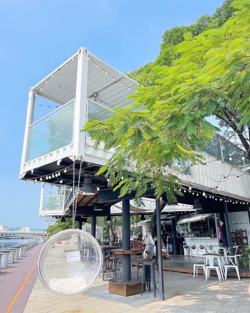高雄的下午天氣炎熱,最適合來一個悠哉的下午茶搭配美景,一邊享用著美食、還能一邊欣賞愛河的美景整個超級chill ,吃完下午茶還能漫步在廊道上,貨櫃屋下方的透明吊椅必打卡的景點,拍照的時候不要整個人坐進去椅子坐一半就好了,另一個打卡點為用餐區吊椅建議拍攝者切齊被拍者的腳哦!
